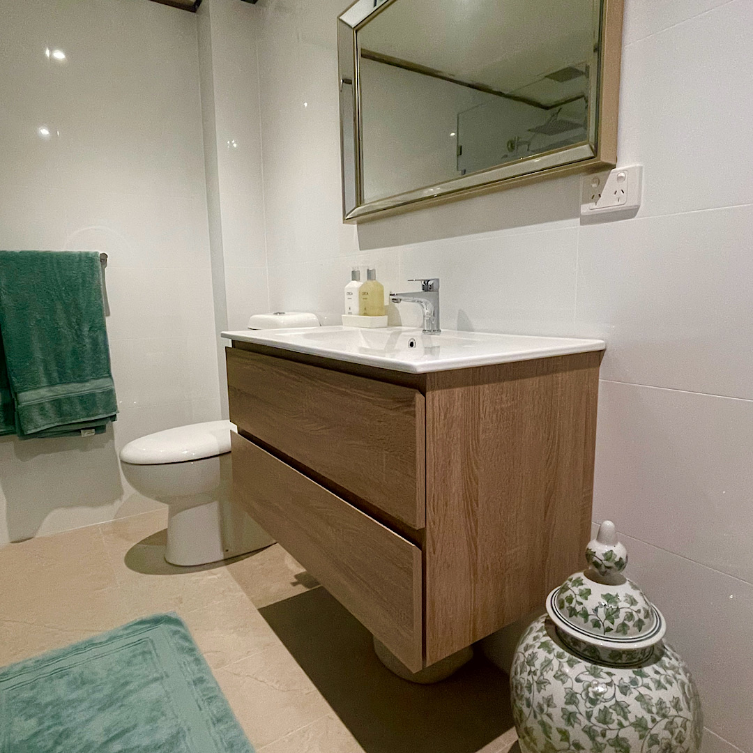 We finally have a calm white, beige and celadon green bathroom, sans cornices and laundry doors but it is nearly there. Being in the Self Knowledge sector it is about belief systems and inner reflection and perhaps that is what this has all been about as we washed dishes and ourselves in a $2 black plastic bucket. Now we have a chic and serene space. This area has the Wood element with green as the colour to use. An oak vanity and the lovely green ceramics and towels balance out the white tiles following the Earth, Metal and Water cycle. A lovely Chinese ginger pot adds a sense of balance and an original print of green leaves is on its way to us in our shipment. Our gentle giant carpenter will fix the cornices, build us some shelves in the laundry and we will replace the laundry doors with a roller blind to allow ventilation.